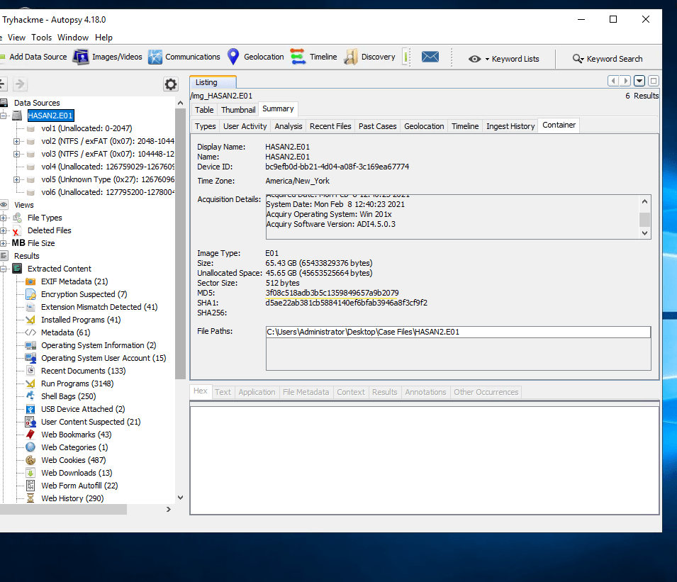 Used Autopsy’s ingest modules and verified hash output from the image metadata panel.