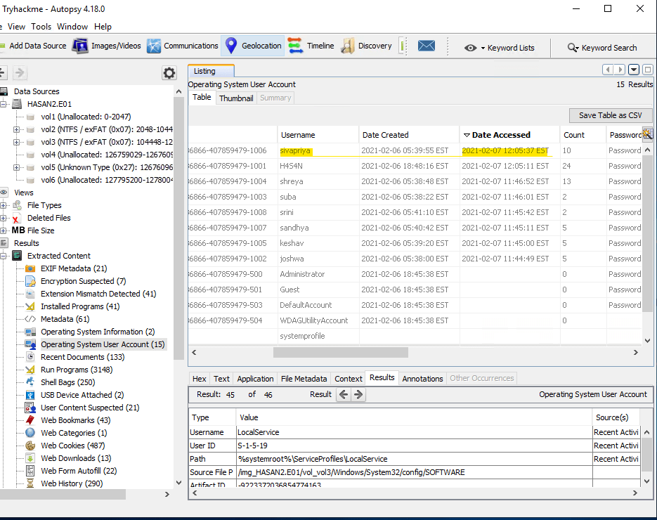 Question 3: List all the user accounts. (alphabetical order) Used the shown registry hive to enumerate all usernames.