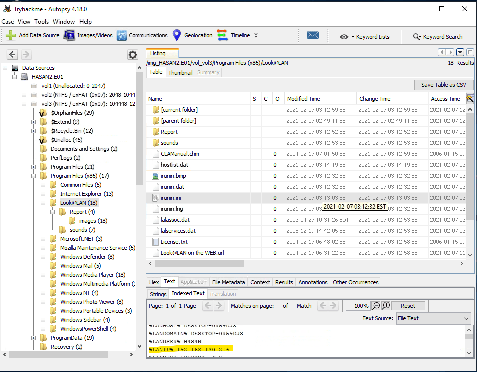 Question 5: What was the IP address of the computer? This is when the lab gets tricky and it takes some searching and previous knowledge on where info is located. I could only find this information under the LOOK@LAN folder in the irunin.ini file. .ini files are configuration files.
