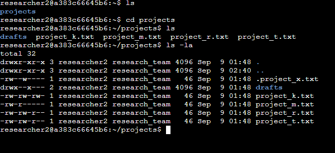 To review all file permissions (including hidden files) in the projects directory, I used the long listing command with the -a option: