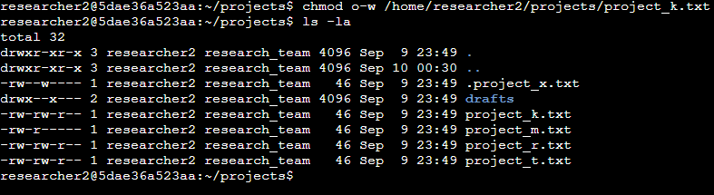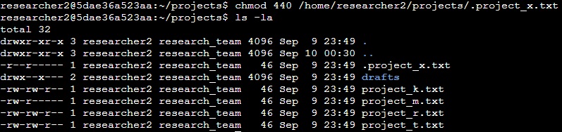 Current permissions: -rw–w—- 1 researcher2 research_team 46 Sep 9 23:49 .project_x.txt